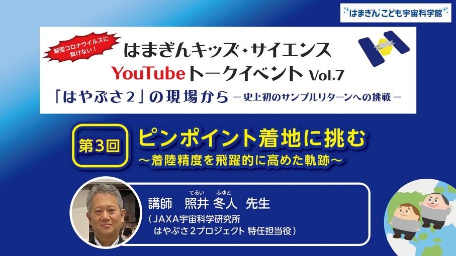 | 第3回 7/11(土) | 「ピンポイント着地に挑む~着陸精度を飛躍的に高めた軌跡~」 (JAXA宇宙科学研究所 照井 冬人 先生) |
