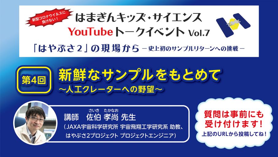 | 第4回 7/25(土) | 「新鮮なサンプルをもとめて~人工クレーターへの野望~」 (JAXA宇宙科学研究所 佐伯 孝尚 先生) |
