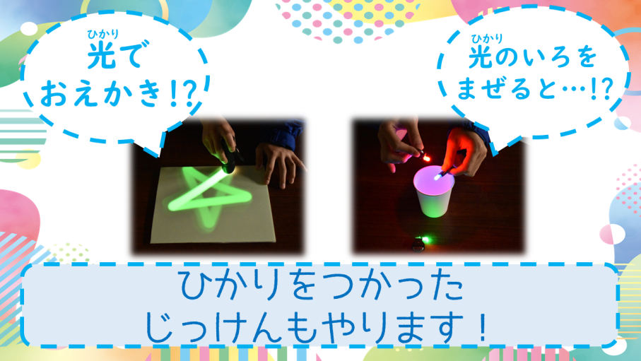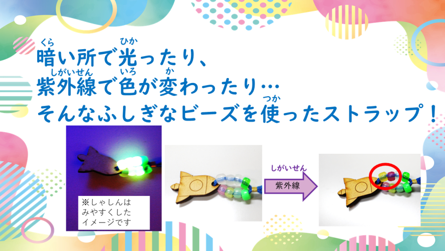 紫外線で色が変わるビーズや蓄光ビーズ、科学館オリジナルのチャームを用い、ストラップを作ります。