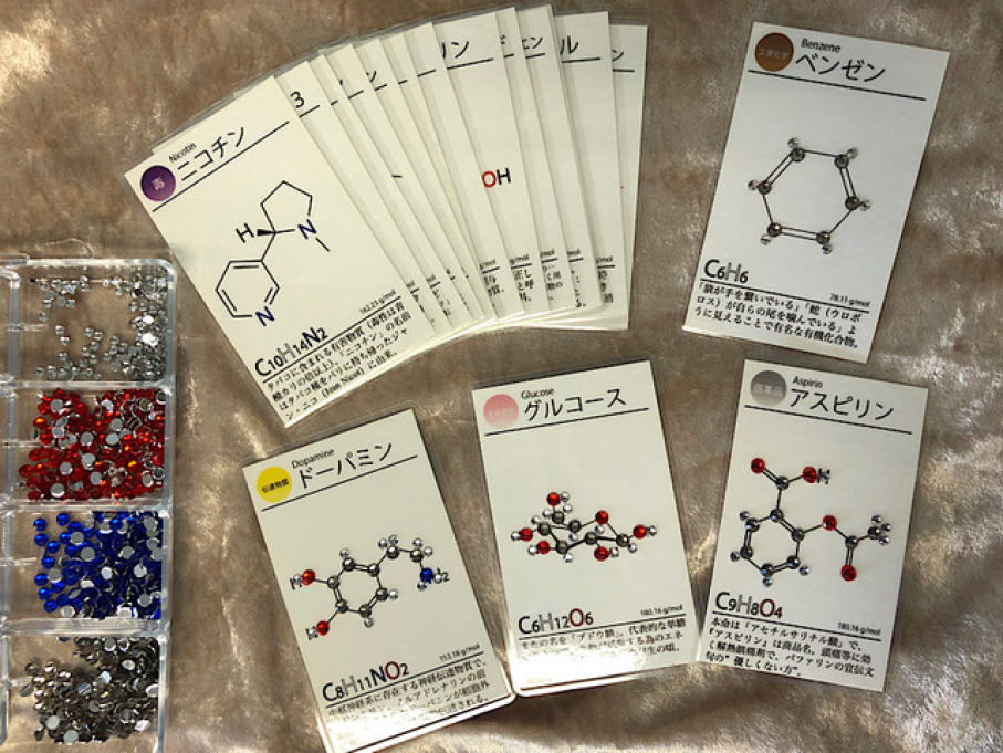 赤(酸素)、青(窒素)、黒(炭素)、白(水素)のキラキラしたラインストーンを使って、分子構造が描かれたカードにデコレーションしていくイベントです。