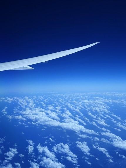 先生の答えは、「私もよくは分からないけど、紫は散乱しすぎて、上の方へ逃げるのも多いから地上に届く量が少なくなっているのかもな」ということだった。そのときはそれで何となく「そうなのか」と「思わされた」けど、実は大きくなって初めて飛行機に乗ったとき、空が「青い」というよりは「藍色」から「紫色」っぽい色に見えることに気づいて、突然あの小学校時代を思い出した(図1)。あの先生の説明、正しかったみたい……。